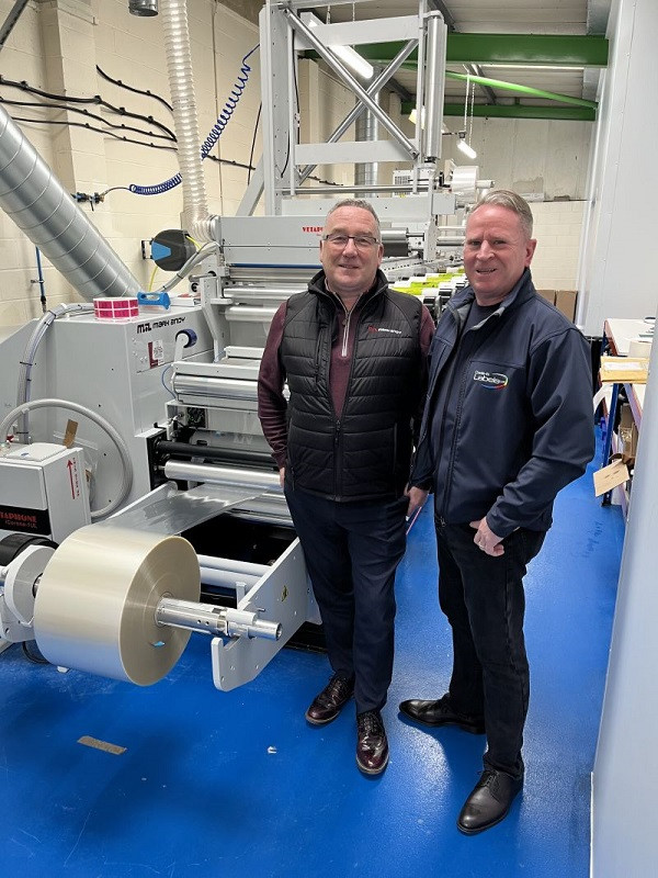 Antony Cotton i Phil Barker przy nowej 20-calowej maszynie fleksograficznej Mark Andy Performance Series P7E