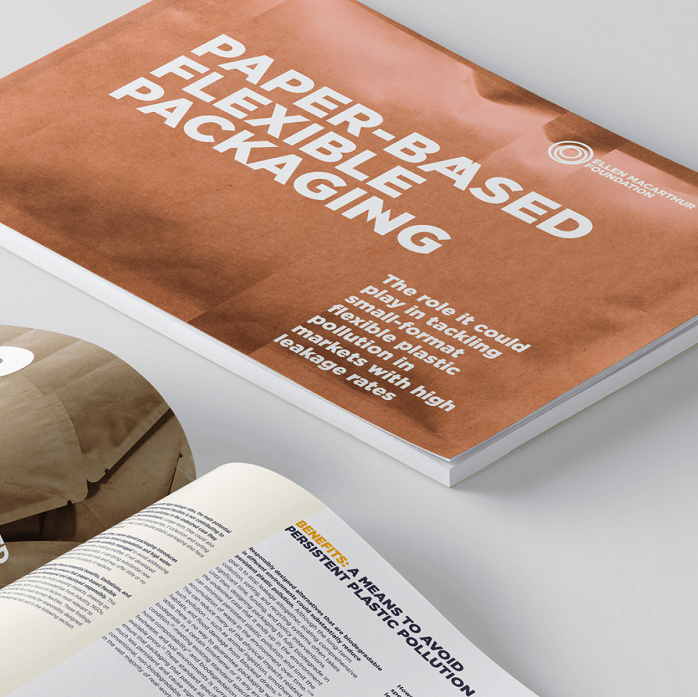 Opakowania giętkie o małych wymiarach, obecnie używane do szerokiej gamy produktów - od przekąsek po szampony - zostały określone w opracowanym przez Fundację programie „2030 Plastics Agenda for Business” jako „bariera systemowa”. Raport wskazuje, że problem tych tworzyw sztucznych powinien zostać rozwiązany priorytetowo, podając przykład rozwijania modeli ponownego użycia na przemysłową skalę.