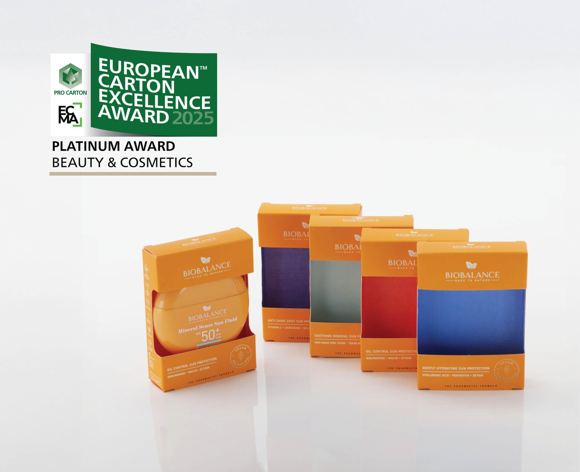 Tektura Metsä Board została również wykorzystana w kilku innych projektach nagrodzonych w konkursie European Carton Excellence Awards. Biobalance ‒ Mineralny Fluid Przeciwsłoneczny firmy Alpaya Dermaceuticals otrzymał platynową nagrodę w kategorii „Kosmetyki i produkty kosmetyczne”. Do produkcji opakowania wykorzystano tekturę MetsäBoard Pro FBB Bright 245 g/m², a jego producentem jest Omaks Packaging. W tej samej kategorii złotą nagrodę zdobyło opakowanie promocyjne dla Germaine de Capuccini wykonane z tektury Prime FBB Bright 305 g/m², którego producentem jest Alzamora Group.
