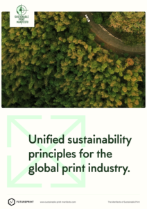 Ogólnobranżowa grupa robocza ogłosiła stworzenie „Manifestu Zrównoważonego Druku” (Sustainable Print Manifesto), dokumentu zawierającego jednolite ramy zrównoważonego rozwoju i opracowanego przez i dla globalnej branży poligraficznej, z myślą o promowaniu odpowiedzialnej produkcji poligraficznej, użytkowania i recyklingu po zakończeniu cyklu życia produktu.