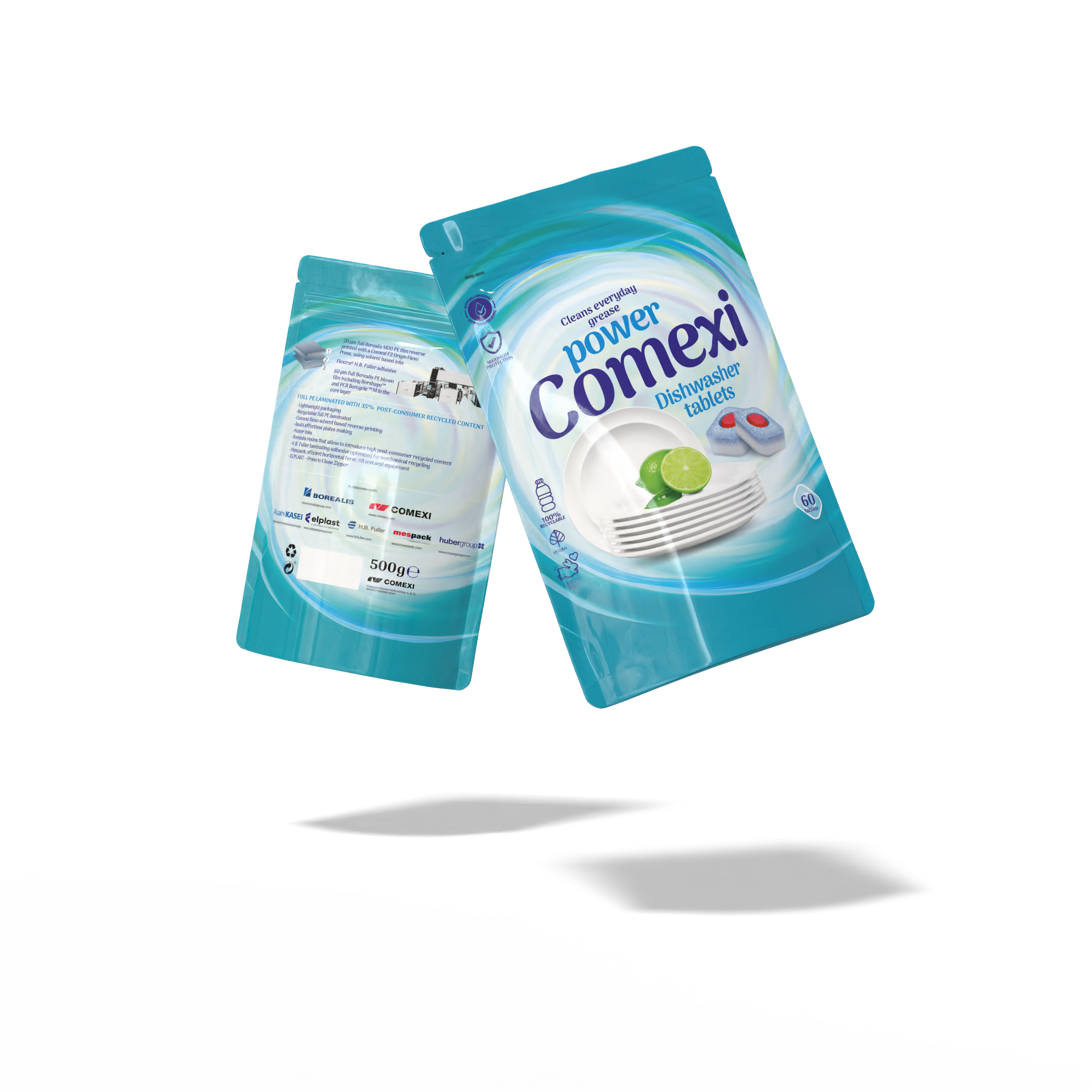 • Cyrkularne saszetki na detergenty z 40% zawartością PCR. Saszetka monomateriałowa MDOPE + PE zaprojektowana pod kątem recyklingu dowodzi, że użycie ponad 40% recyklatu z odpadów domowych (PCR) nie pogarsza wyglądu produktu na półce. Zadrukowana w technologii Offset CI, stanowi rozwiązanie zgodne z normami europejskimi, konkurencyjne cenowo i estetyczne. Będzie prezentowana w dwóch wersjach: z nadrukiem odwróconym i laminacją, druga wyłącznie z nadrukiem powierzchniowym na identycznej strukturze. Projekt jest realizowany z Dow, Mespack i Reifenhauser.